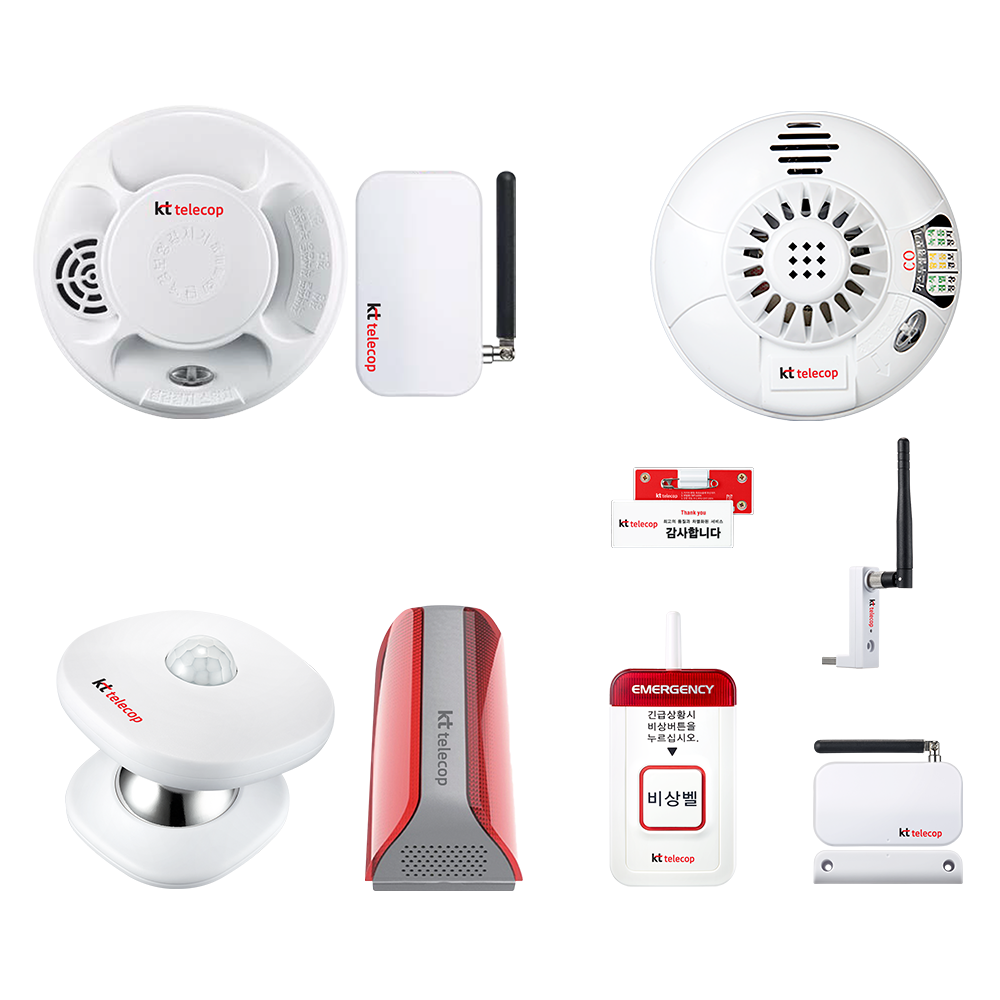 KT텔레캅 IoT의 종류는 화재, 움직임, 문열림 감지기와 사이렌 경광등, 비상벨, 명찰형 비상벨로 구성되어 있고 필요에 따라서 선택하여 설치가 가능합니다. 마트, 편의점 등에 추천하는 IoT 상품은 종합보안 패키지로 화재, 문열림, 움직임 감지기와 사이렌 경광등이 포함되어 언제 어디서나 비상 상황 발생시 스마트폰으로 알림을 받아 볼 수 있습니다.